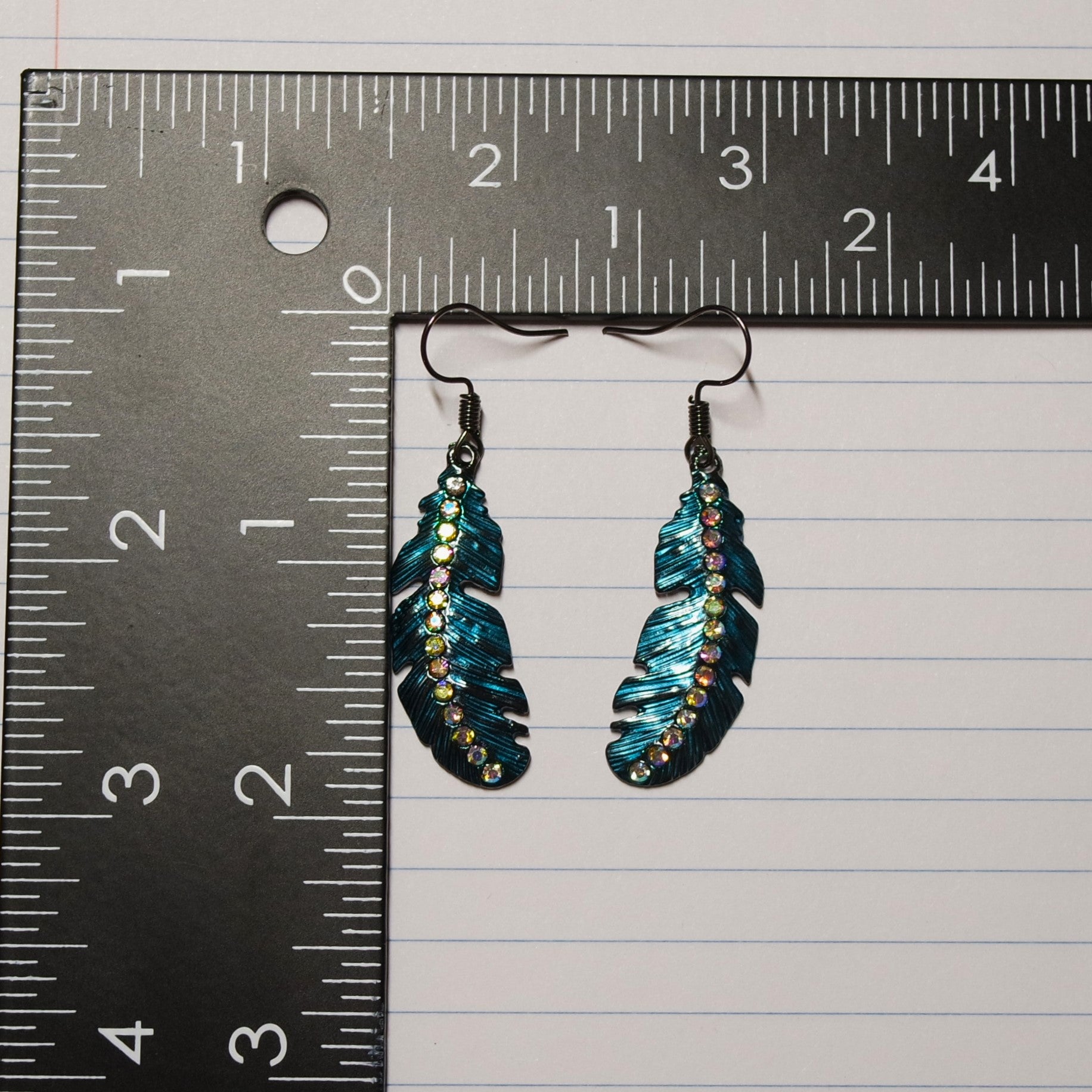 Blue Shimmer Feather with Rhinestone Accents Dangle Earrings