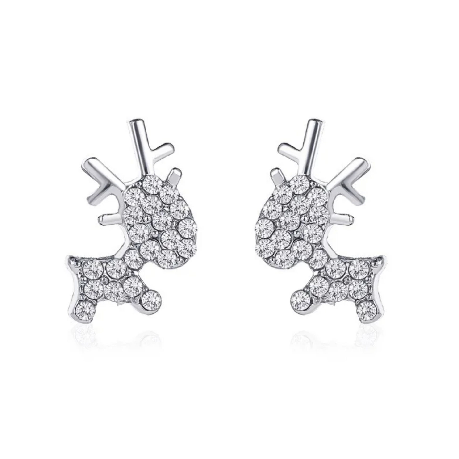 Crystal Encrusted Tiny Reindeer Stud Earrings Clear Stones Silver Tone