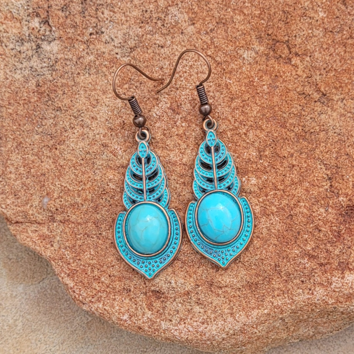 Moroccan Bohemian Style Antique Bronze and Green Finish Abstract Feather Teardrop Dangle Earring
