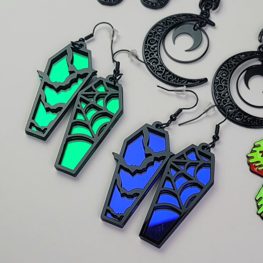 Spooky mirror effect coffin shaped earrings in Green and Blue!!